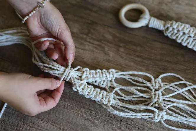 - Umieść doniczkę w środku splotu i zabezpiecz ją kolejnymi węzłami.